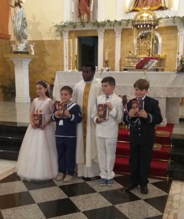En este día de la Santísima Trinidad cuatro de nuestros niños – Paula, Aarón, Ángel José y Ismael van a recibir por primera vez Jesucristo en la Eucaristía. ¿Que regalo mas bonito se puede pedir en esta fiesta tan bonita? Damos gracias a Dios por estos niños, sus padres, catequistas y familiares. Recibir la Eucaristía cada vez que asistimos en la Santa Misa es el mejor regalo que la Trinidad ha dejado a la Iglesia para continuar la obra misionera de Jesucristo en el mundo. Paula, Aarón, Ángel José y Ismael nunca olvidéis que la eucaristía es Jesucristo. Nunca olvidéis que Jesucristo quiere venir a vosotros muchas veces. Por tanto, hay que tener la ilusión de recibirlo a menudo. Aquí en la comunidad parroquia tenéis la oportunidad de recibirlo cada domingo en la misa. Muchas personas ya no tienen la ilusión ni a la Misa ni a la Eucaristía. Esto no tiene que pasa a vosotros. Y sabéis que para recibir Jesucristo hay que prepara nuestra casa bien – esta casa en nuestros corazones. Si nuestra casa no esta limpia para recibirlo entonces hay que limpiarla, cambiar las ropas sucias, y decora bien la casa. Estamos hablando de sacramento de penitencia, que nos limpia de nuestras pecados y manchas y así recibimos Jesucristo con un corazón limpia. No olvidéis que tenéis la obligación de comulgar al menos una vez al año y al confesar los pecados al menos una vez al año especialmente en la pascua. Que vosotros no seáis como los que reciben la primera comunión y nada mas pisa la puerta de la Iglesia hasta la boda. Por tanto, los padres, familiares, catequistas y la comunidad parroquial tienen una tarea importante – de cuidar y vela por la fe y el crecimiento espiritual de estos niños que hoy hacen su primera comunión. Que el Señor nos ayude a ser fieles a estos compromisos.